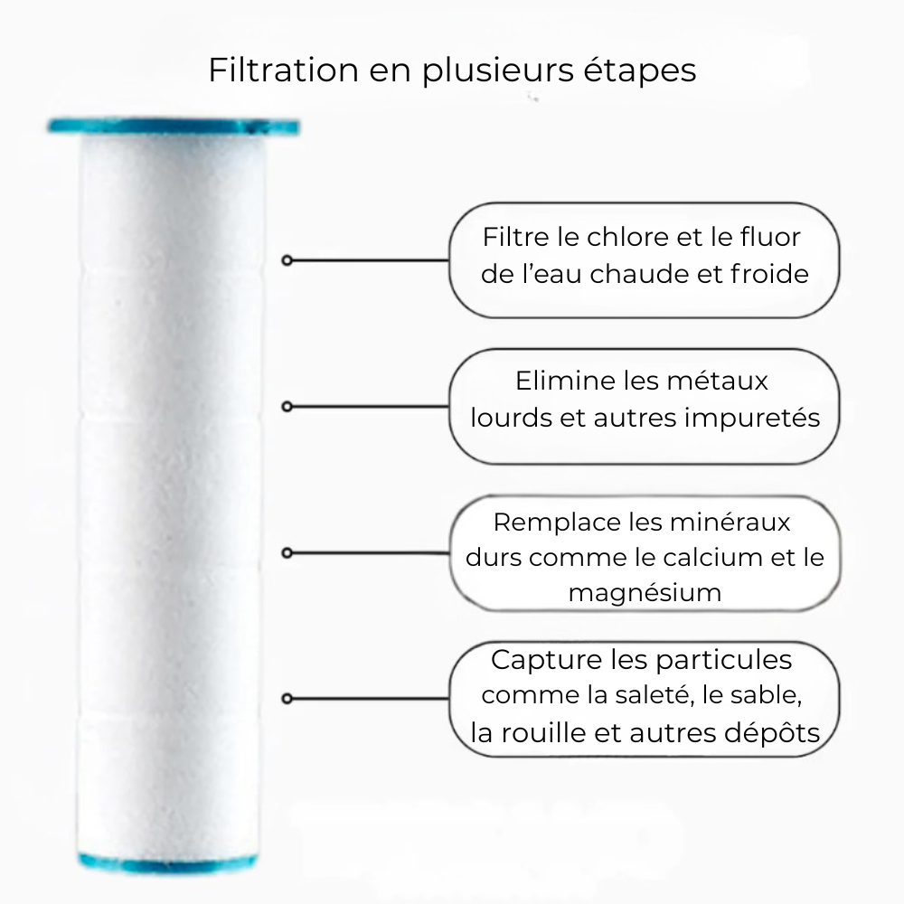 - Filtre le chlore,le calcaire et les impuretés de l'eau